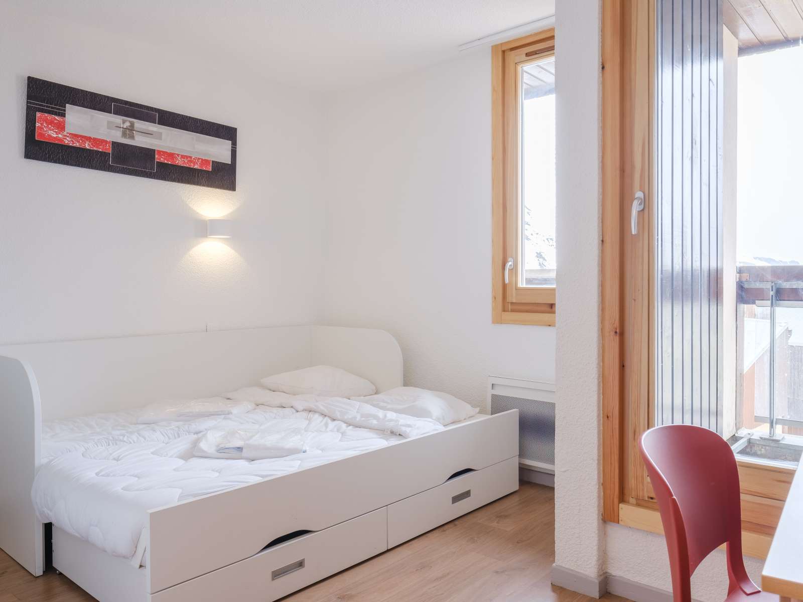 28 m² environ. Rez-de-chausséeou étages 1, 2, 3, 4, 5 et 6 avec balcon. Séjour avec un lit gigogne pour 2 personnes et télévision. Chambre avec 2 lits simples superposés et un lit tiroir Cuisine équipée avec réfrigérateur, lave-vaisselle, plaques de cuisson, micro-ondes. Salle de bains avec WC