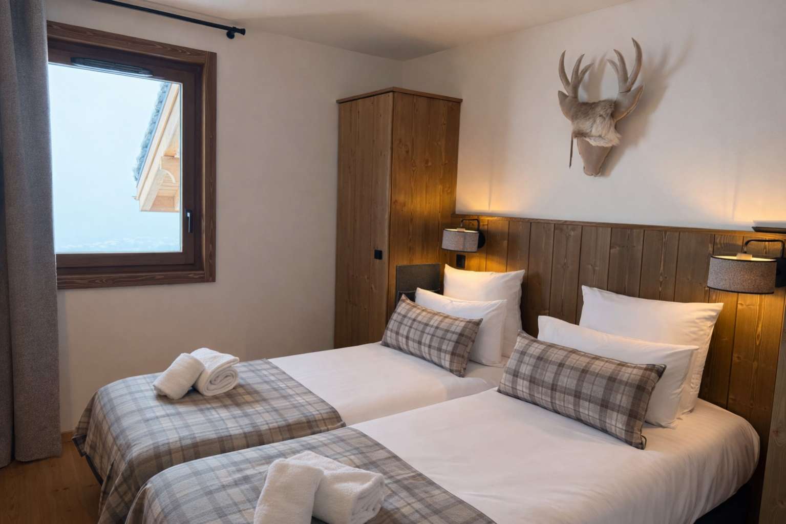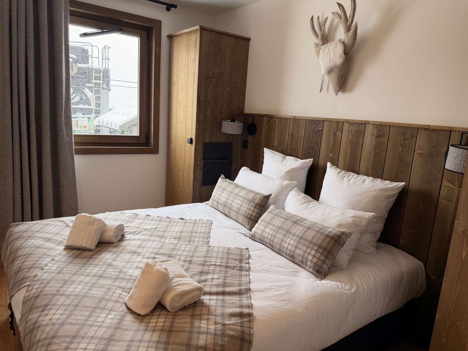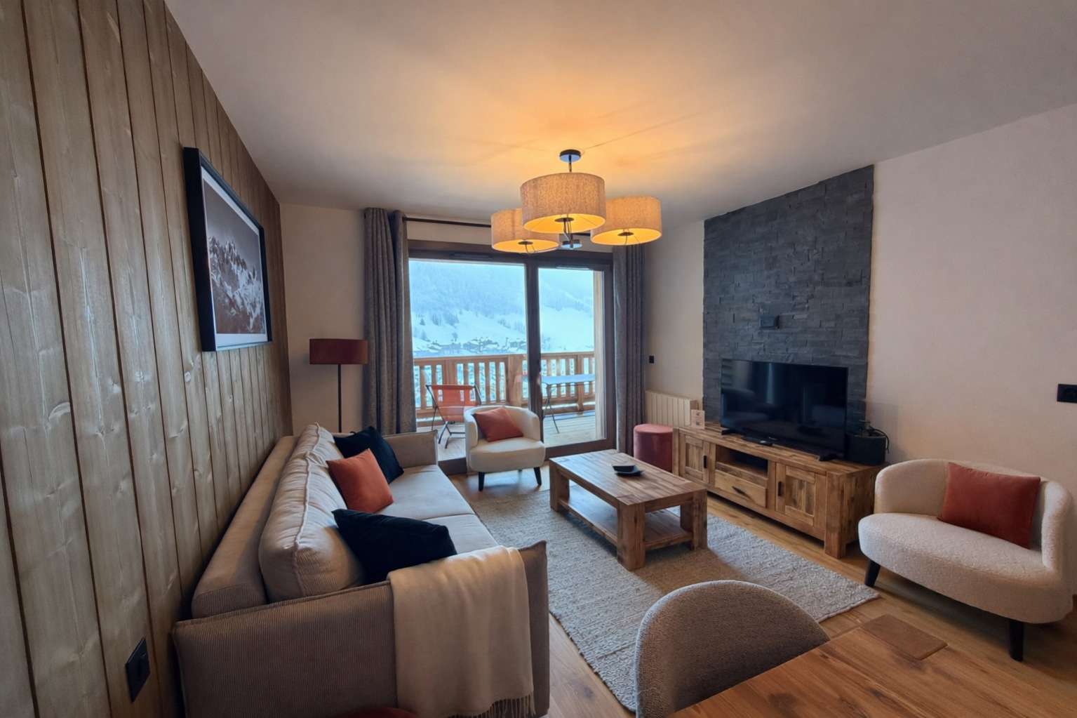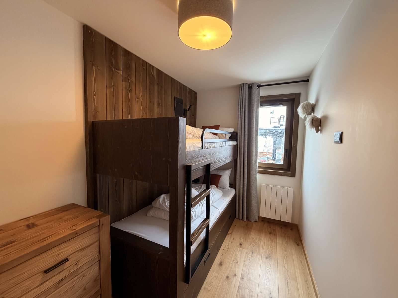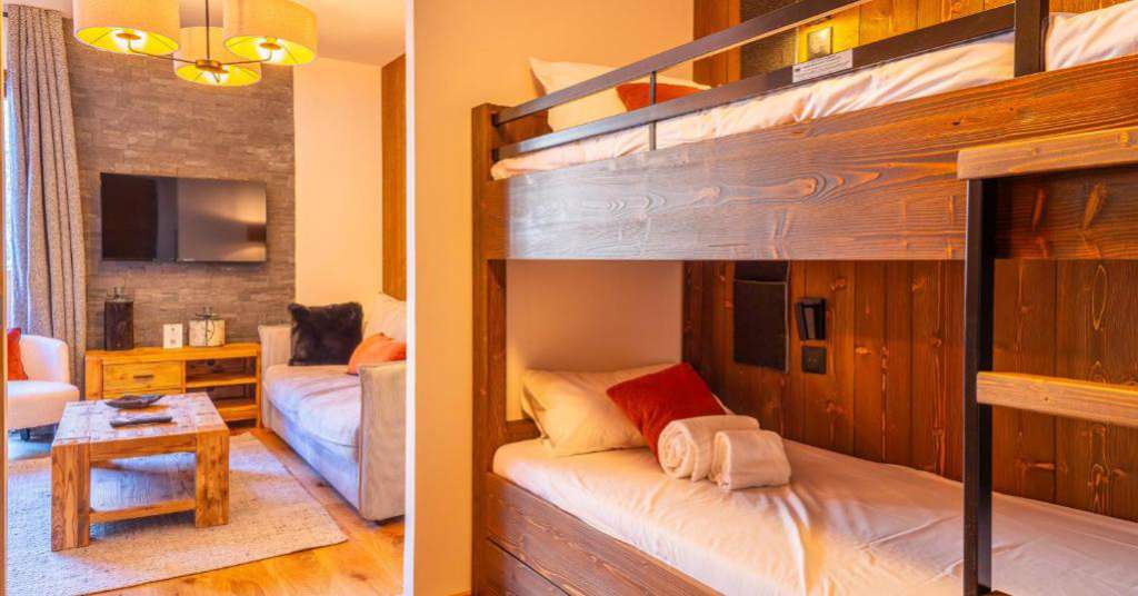 55/65 m², séjour canapé-lit 2 personnes, chambre 1 lit 2 personnes (160 x 200 cm), chambre 2 lits 1 personne + 1 lit 1 personne en hauteur, 2 salles de bains ou douches. Vue pistes