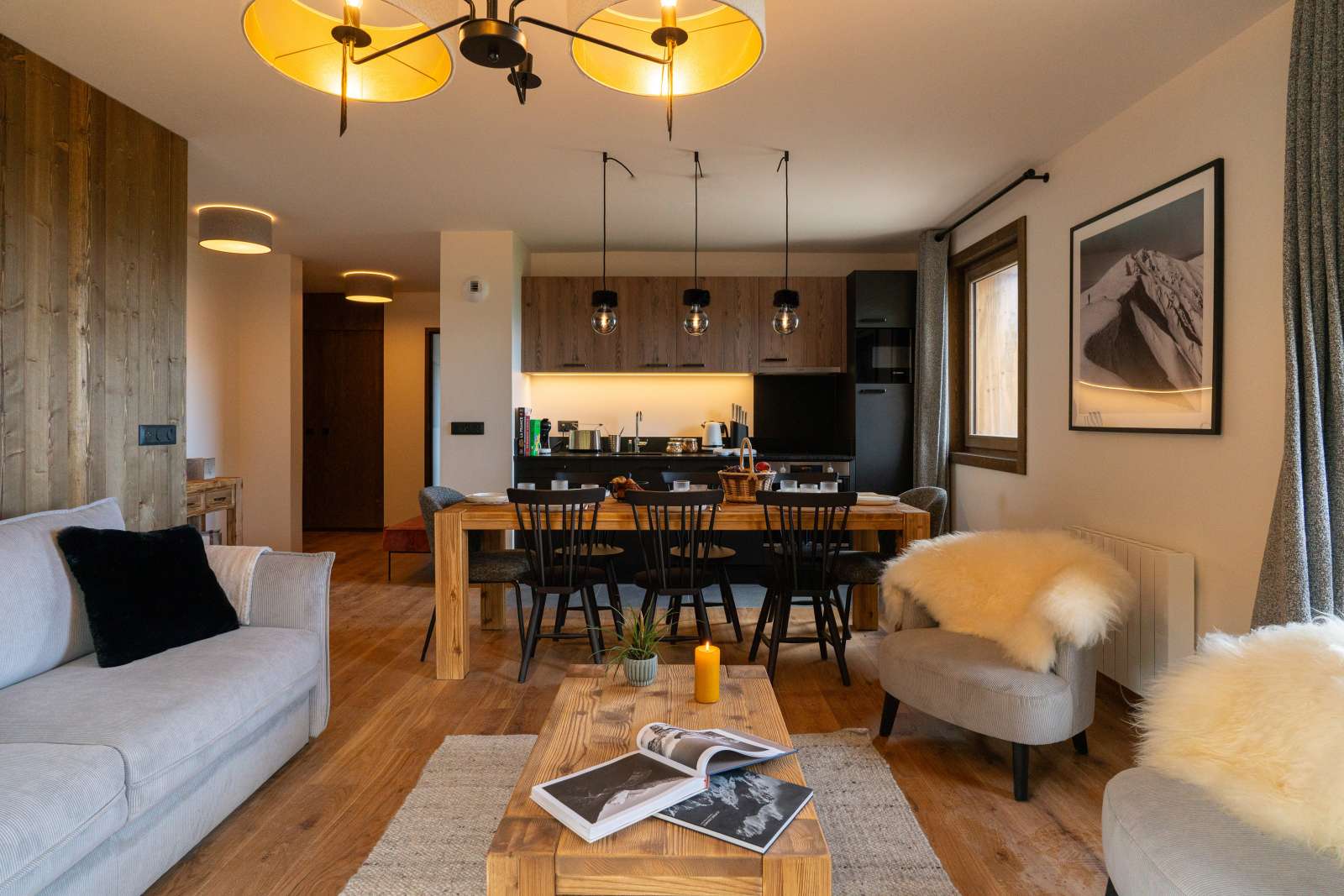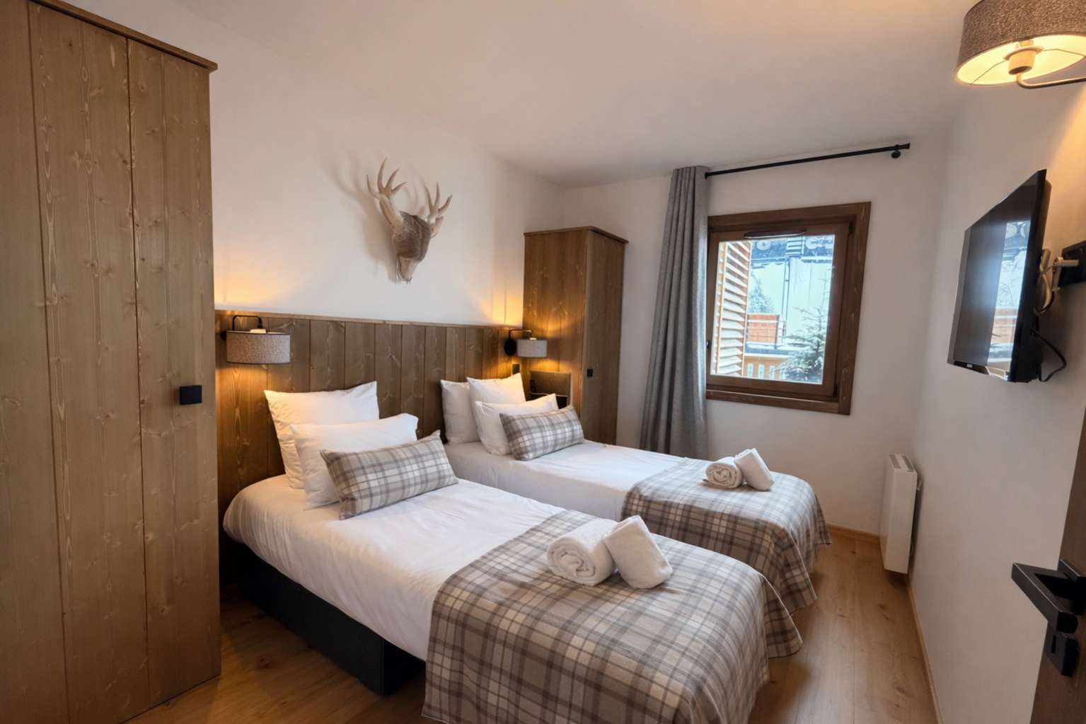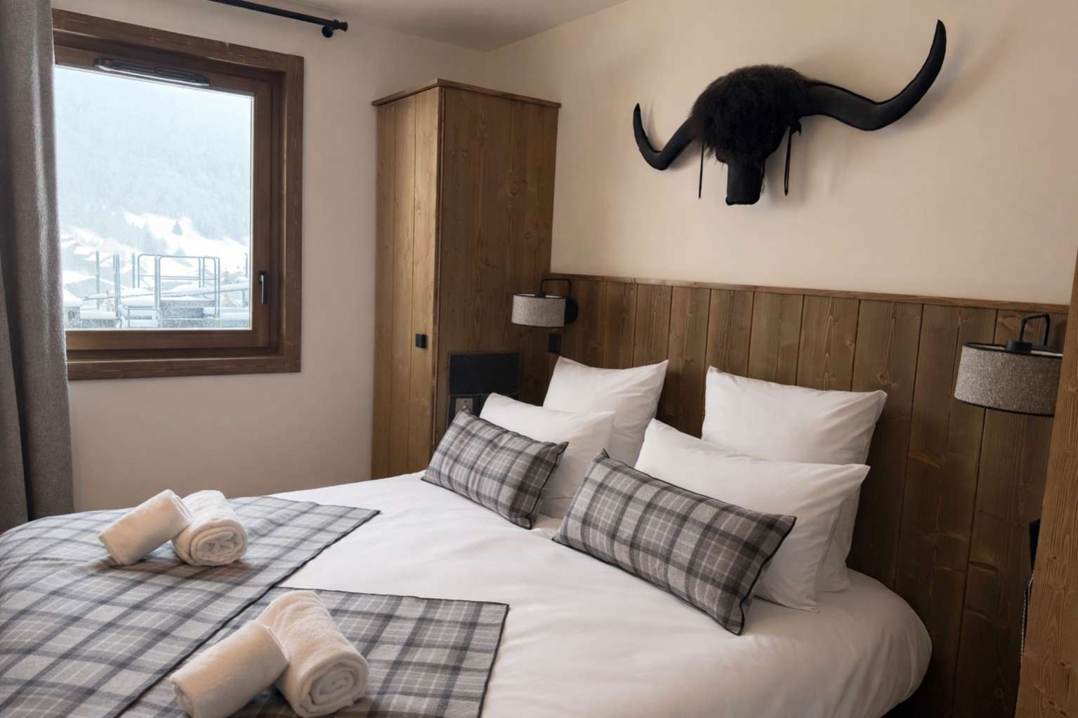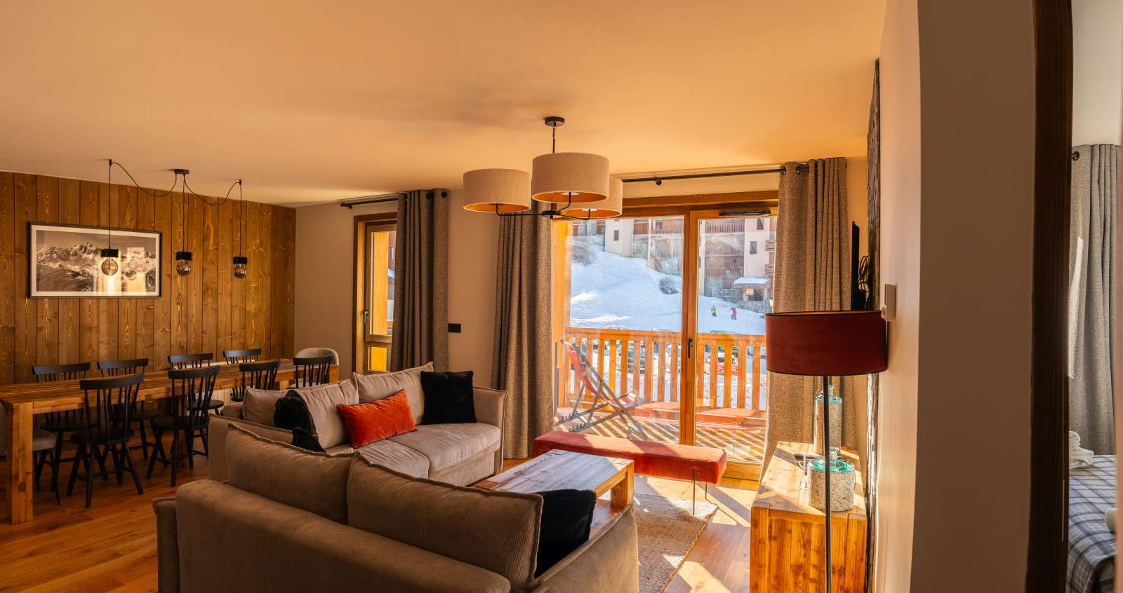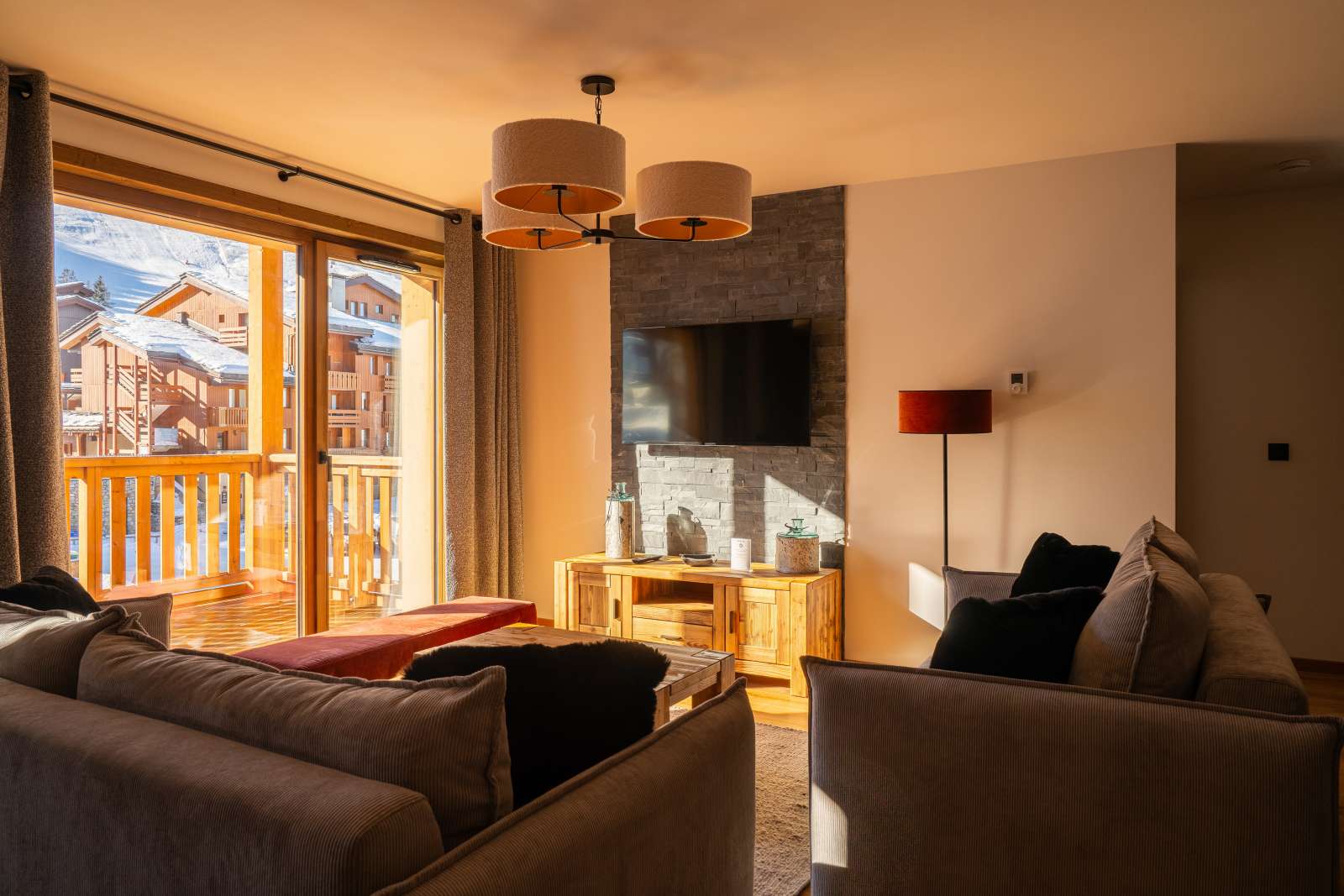 55/65 m², séjour canapé-lit 2 personnes, chambre 1 lit 2 personnes (160 x 200 cm), chambre 2 lits 1 personne + 1 lit 1 personne en hauteur, 2 salles de bains ou douches. Vue pistes