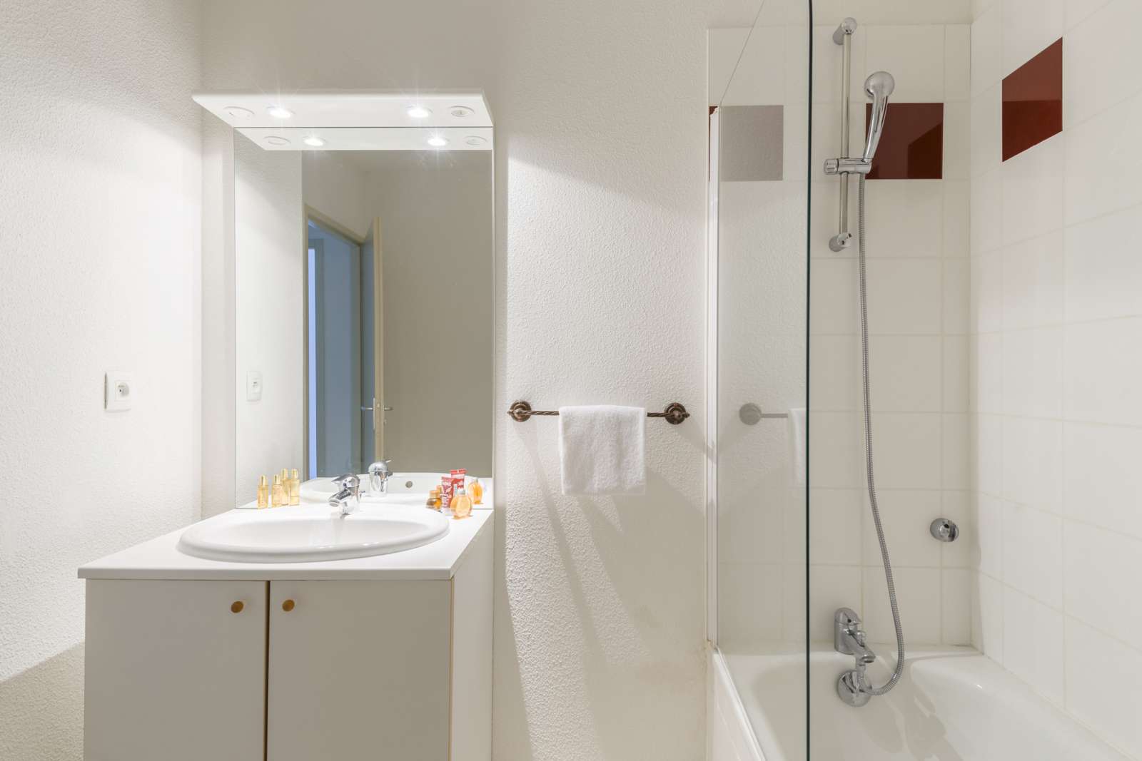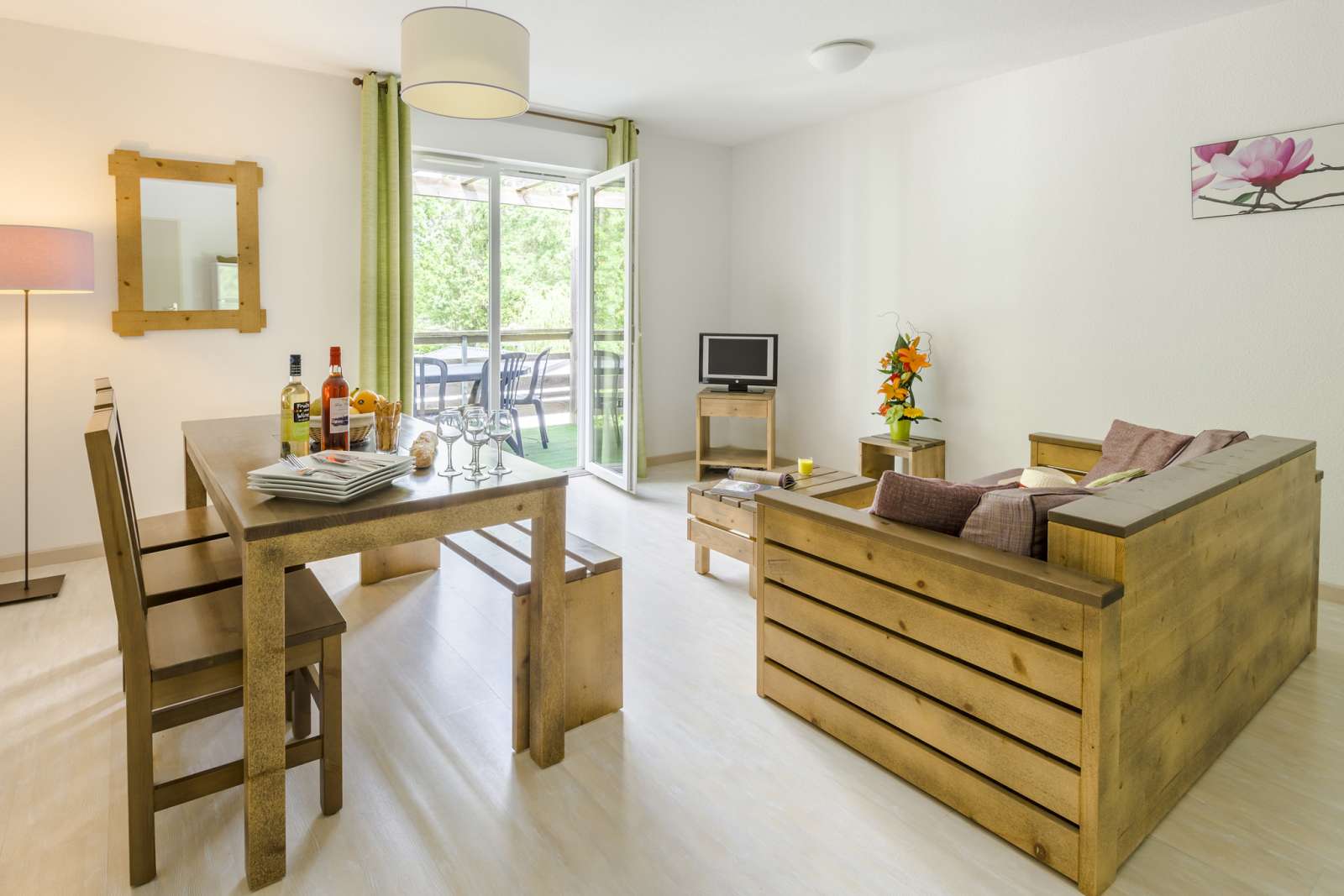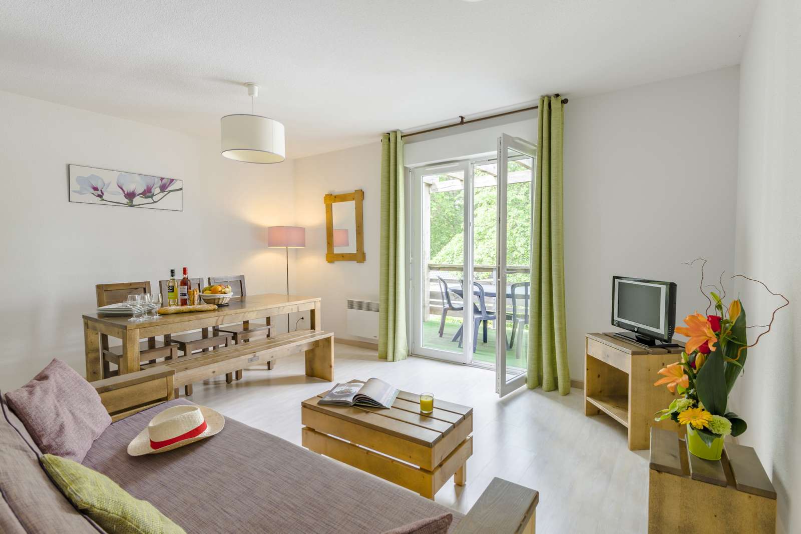 28 m² environ, un séjour avec un canapé-lit 2 personnes, une chambre 1 lit 2 personnes (fermée par une cloison mobile ou une porte coulissante).