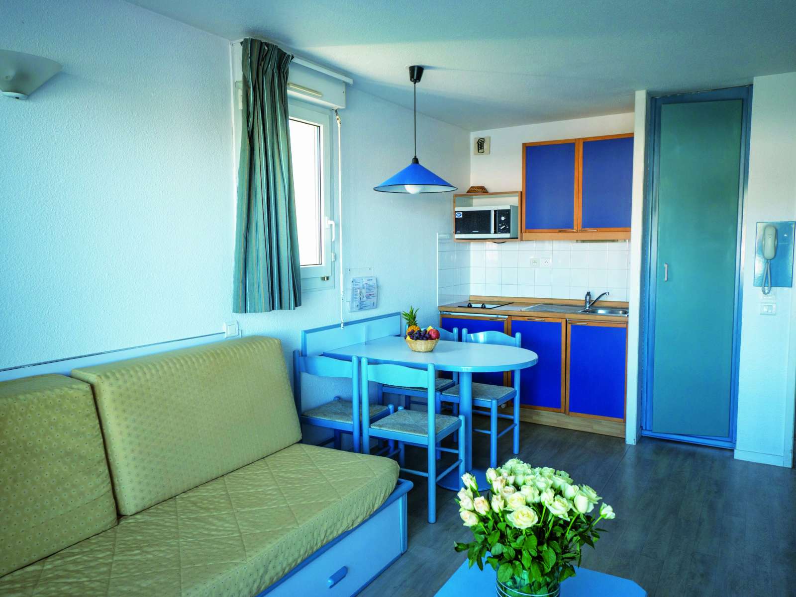 23 m² environ, un séjour canapé-lit 2 personnes, une cabine 2 lits superposés, une salle de bains.