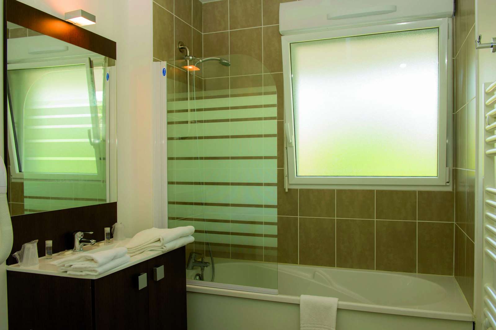 33/41 m², séjour canapé-lit 2 personnes, chambre 2 lits 1 personne, salle de bains (baignoire + douche).