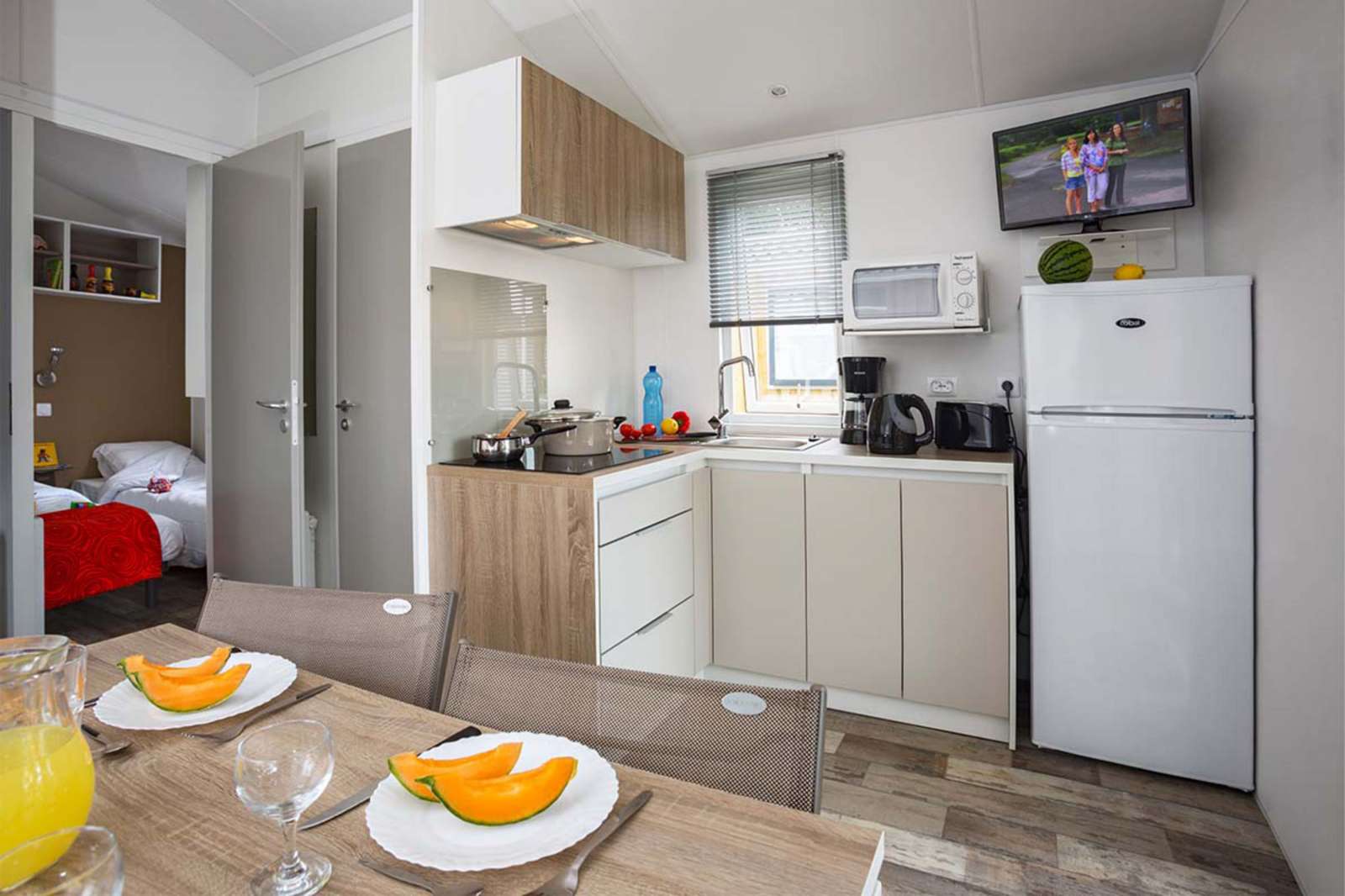 25 m² environ, un séjour avec un canapé-lit 2 personnes, une chambre avec 1 lit 2 personnes et une chambre avec 2 lits 1 personne.