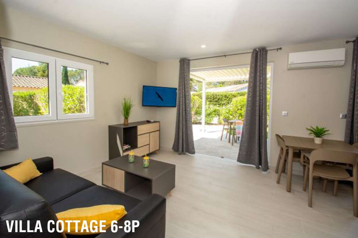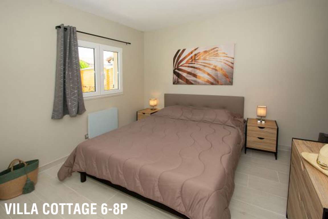 28 m² environ, un séjour avec couchage d'appoint 2 personnes, une chambre avec 1 lit 2 personnes, une chambre avec 2 lits 1 personne. Terrasse semi-couverte de 15 m² environ avec salon de jardin.