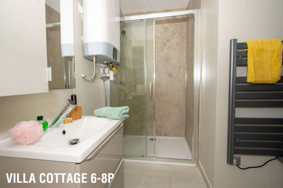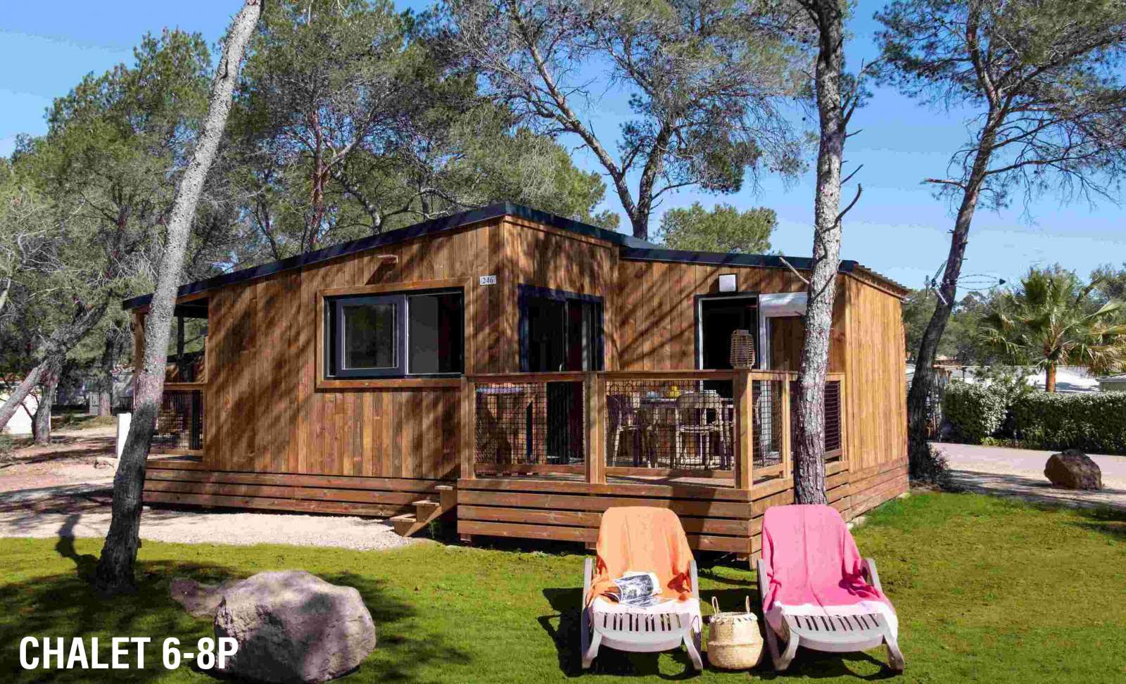 (5 adultes ou 4 adultes + 2 enfants -12 ans maximum) 30 m² environ, un séjour avec couchage d'appoint 2 personnes, une chambre avec 1 lit 2 personnes, une chambre avec 2 lits superposés. Une terrasse de 9 m² environ avec salon de jardin et 2 transats.