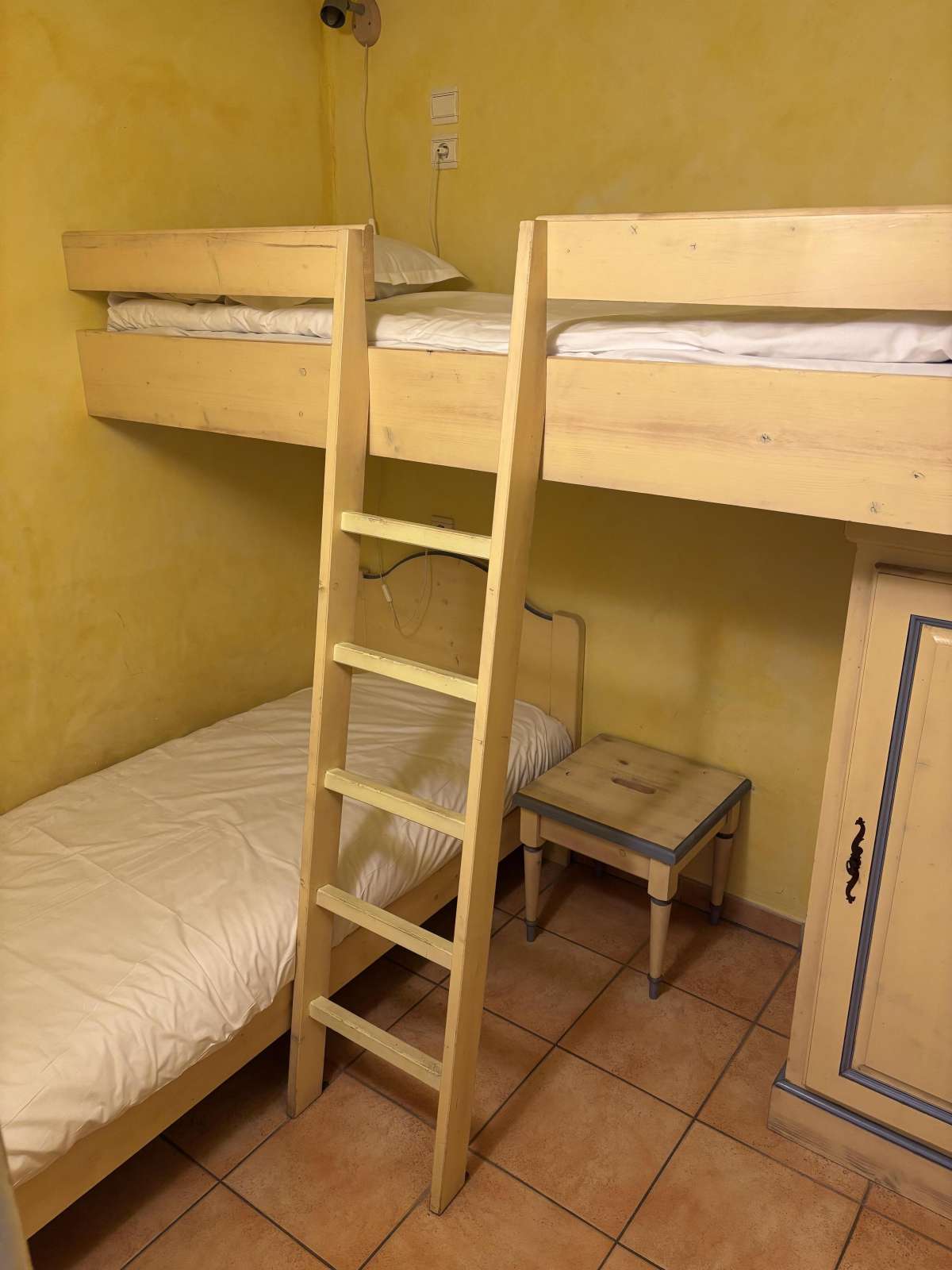 31 m² environ, un séjour avec une banquette lit gigogne, une chambre 2 lits 1 personne, une alcôve séparée par un rideau 2 lits superposés en quinconce, une salle de bains.