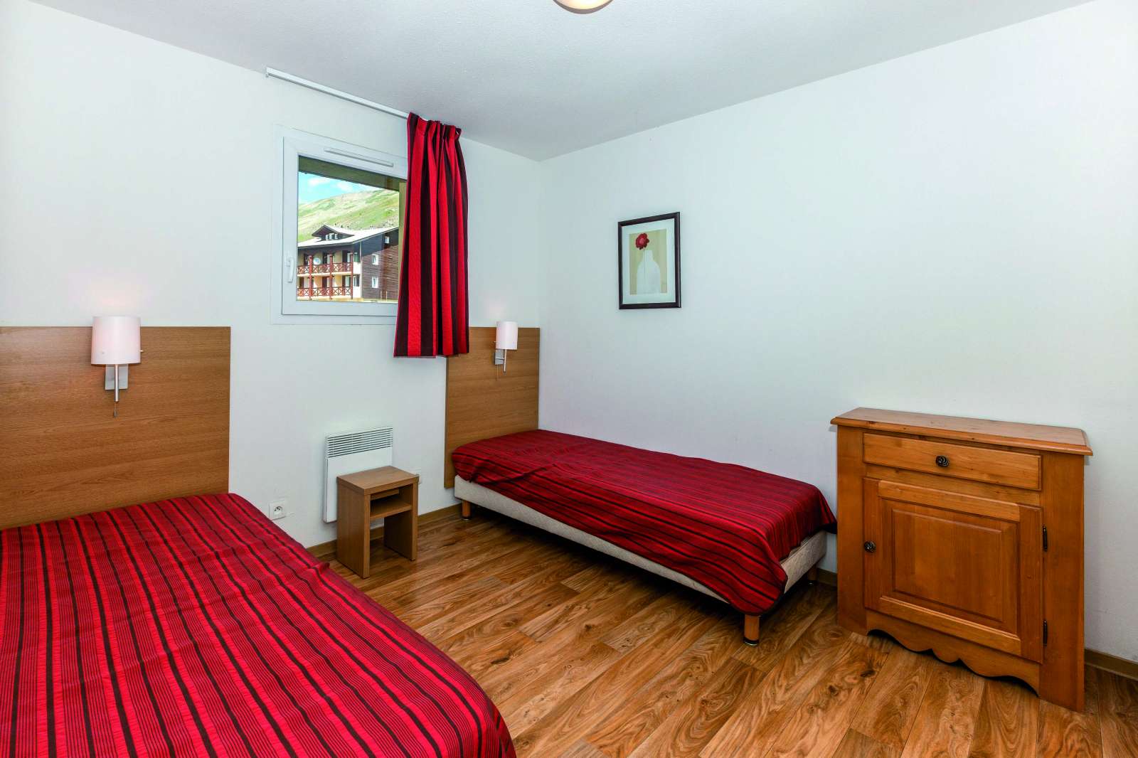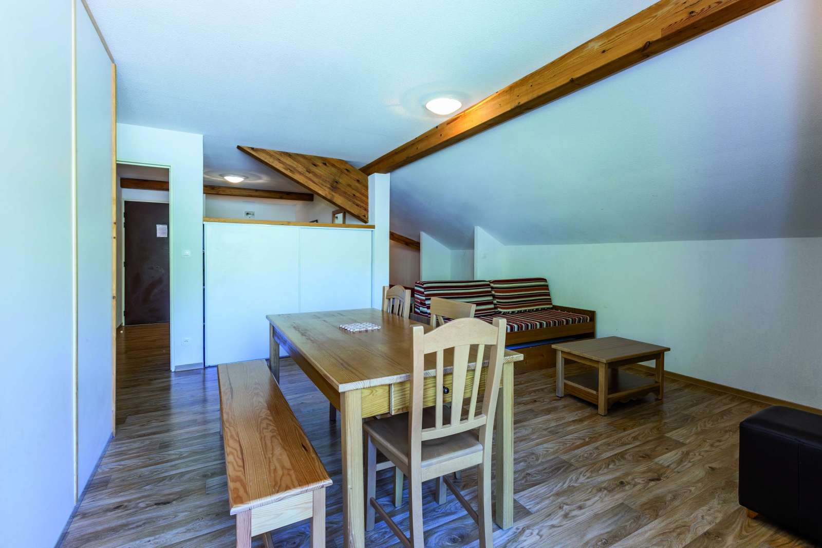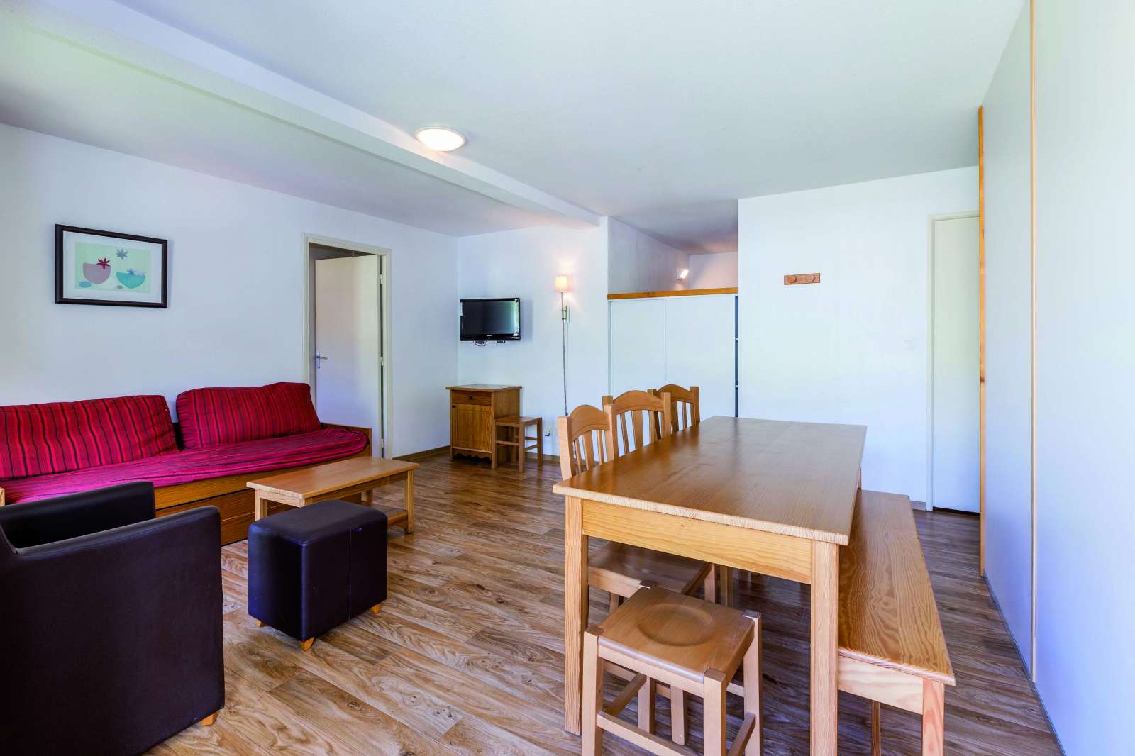 42/45 m², un séjour avec une banquette lit gigogne 2 personnes, deux chambres 2 personnes et une salle de bains.
