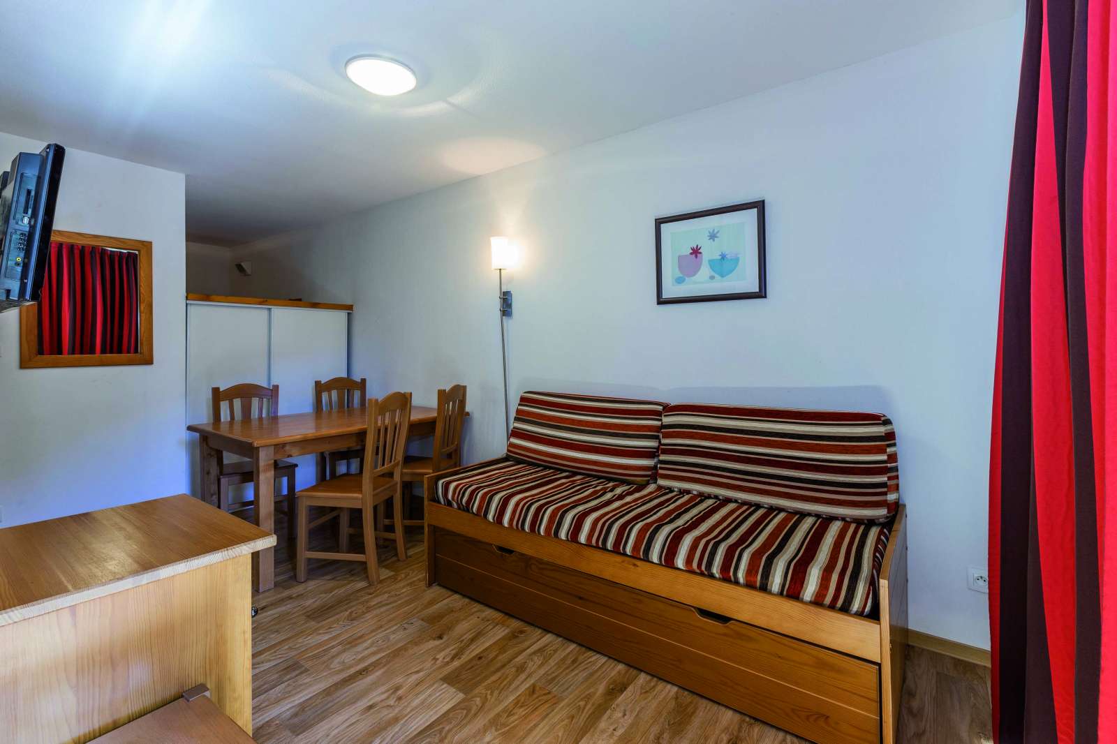 42/45 m², un séjour avec une banquette lit gigogne 2 personnes, une chambre 1 lit 2 personnes, un coin montagne 2 lits superposés et une salle de bains.