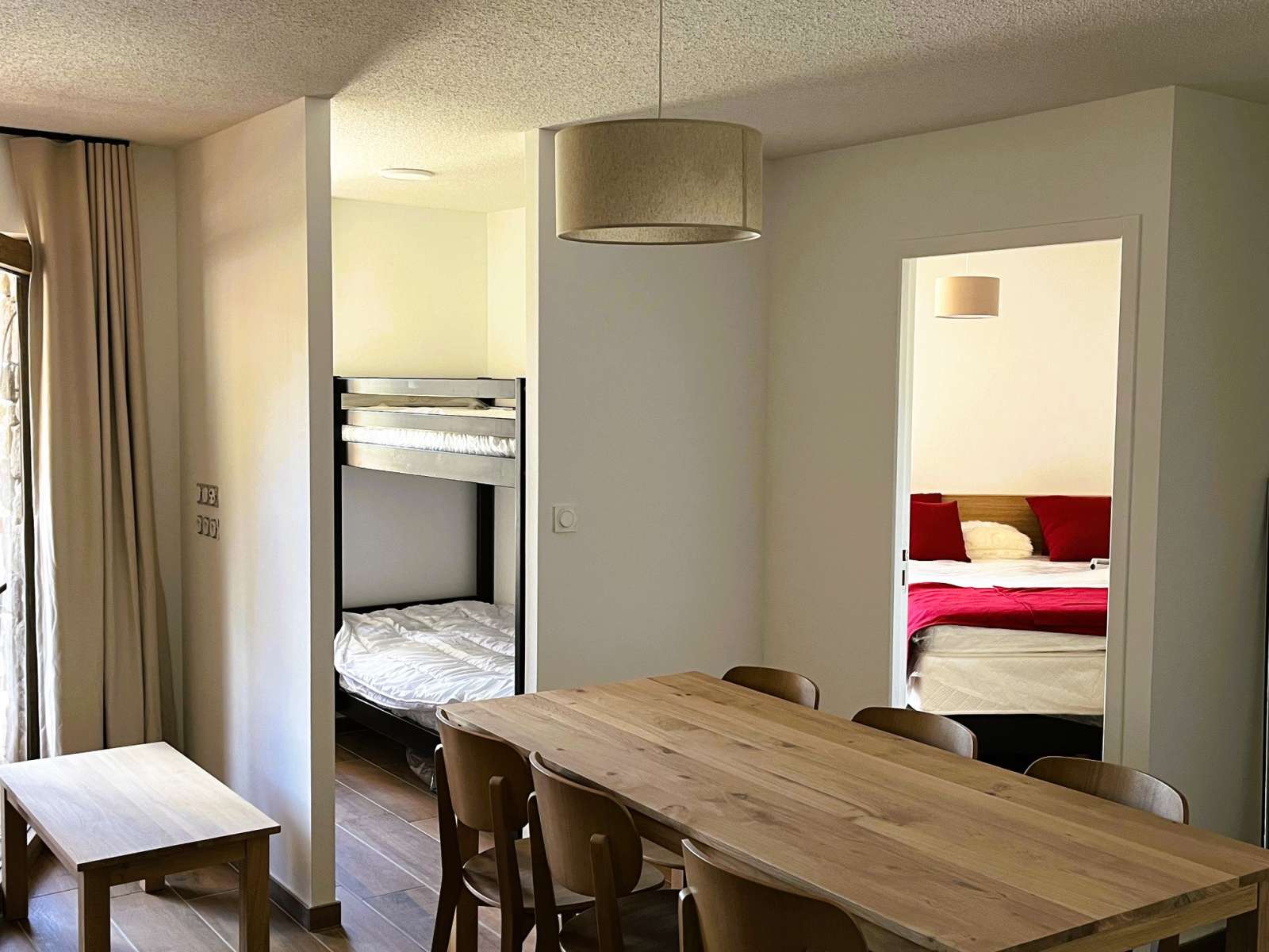 42/46 m², séjour canapé-lit 2 personnes, chambre 2 personnes, chambre 2 lits superposés.
