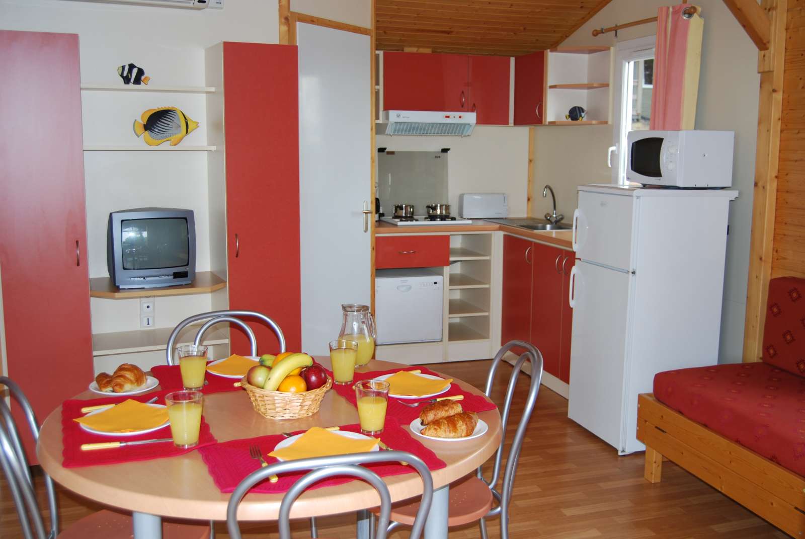 32 m² environ, un séjour, une chambre 1 lit 2 personnes, une chambre 2 lits 1 personne, une terrasse couverte de 9 m² environ.