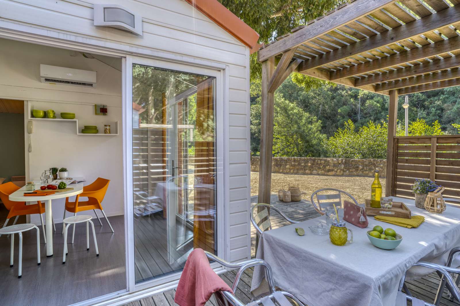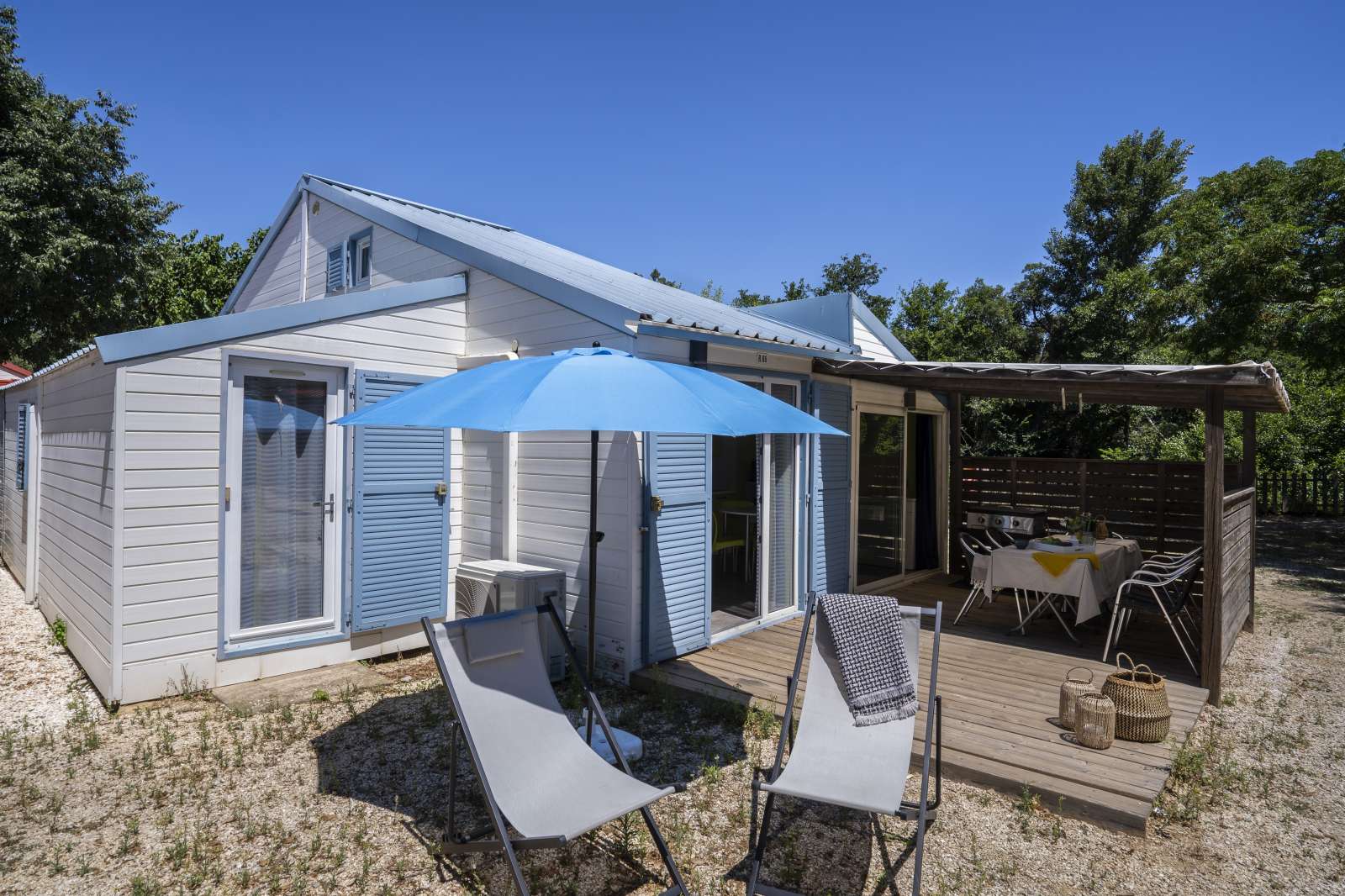 40 m² environ (4 adultes maximum + 2 enfants -18 ans), une kitchenette avec four + micro-ondes + plaques vitrocéramiques + lave-vaisselle, la climatisation, deux salles de bains, une chambre avec 1 lit 2 personnes avec télévision, une chambre avec 2 lits 1 personne avec télévision, un mezzanine avec 2 lits 1 personne. Une terrasse en bois semi-couverte avec salon de jardin.