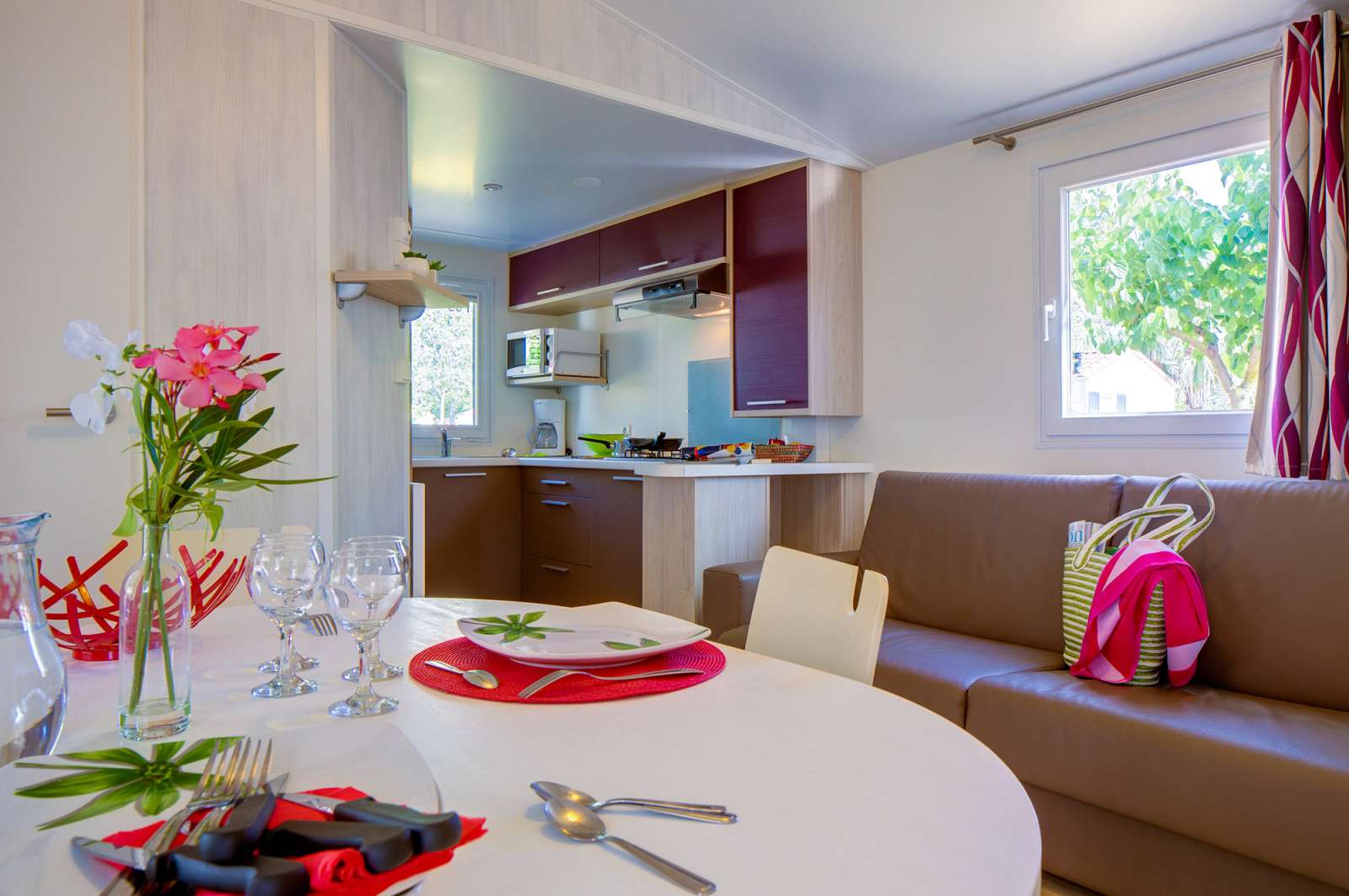 31 m² environ, séjour canapé-lit 2 personnes, chambre 1 lit 2 personnes, chambre 2 lits 1 personne. Terrasse bois fermée en hauteur avec salon de jardin et bains de soleil.