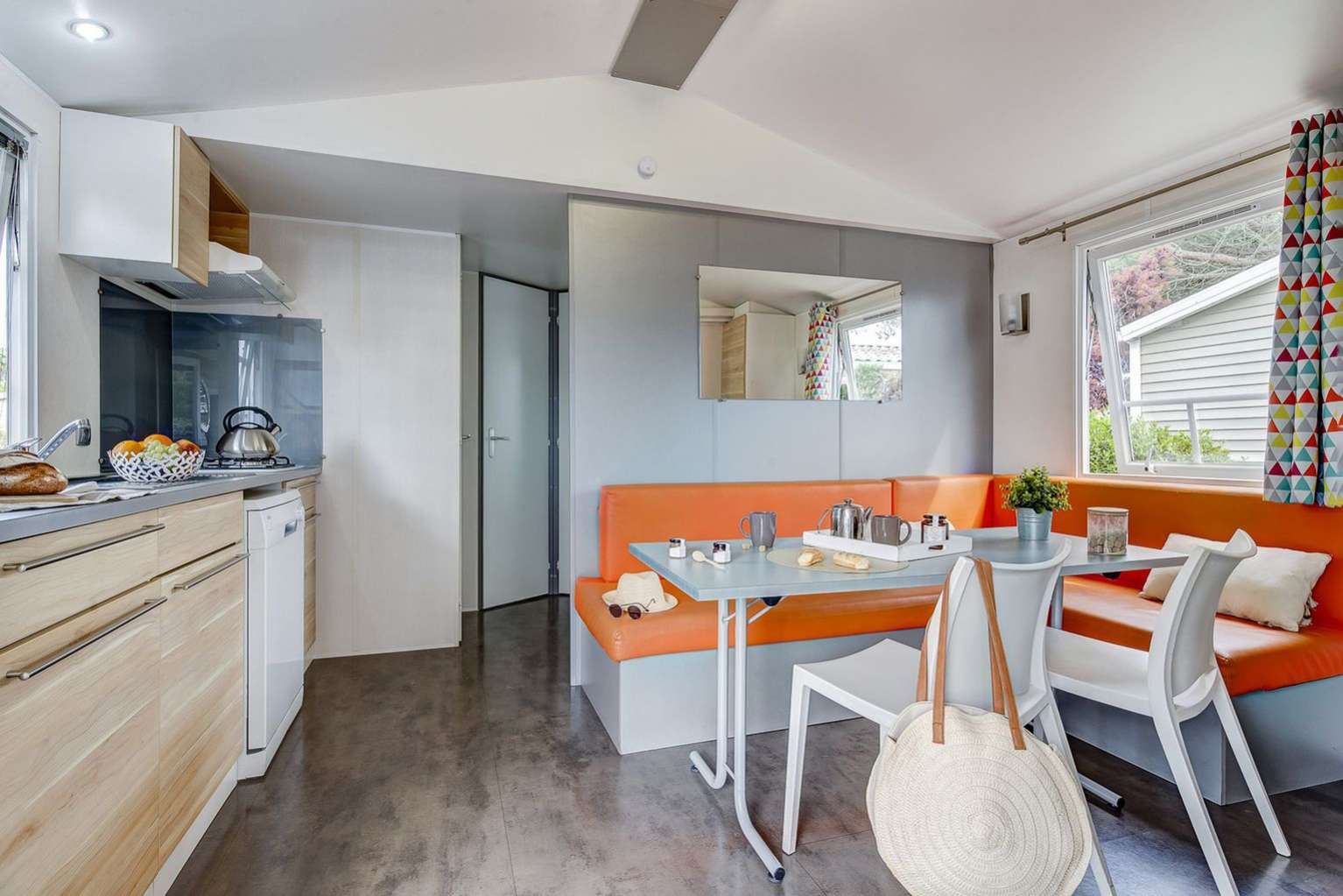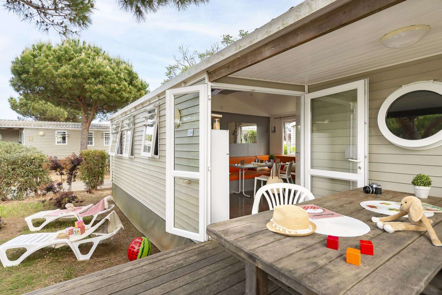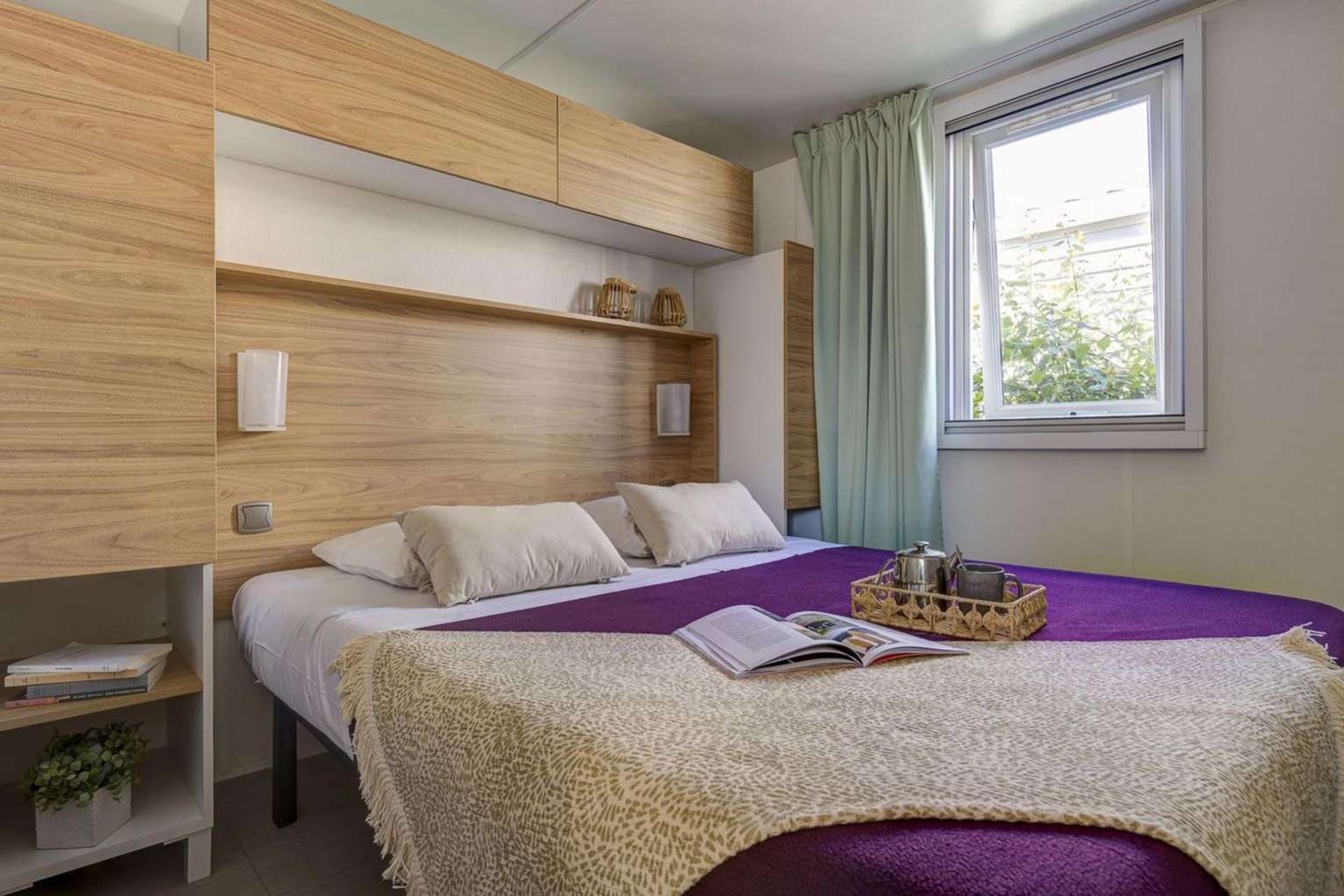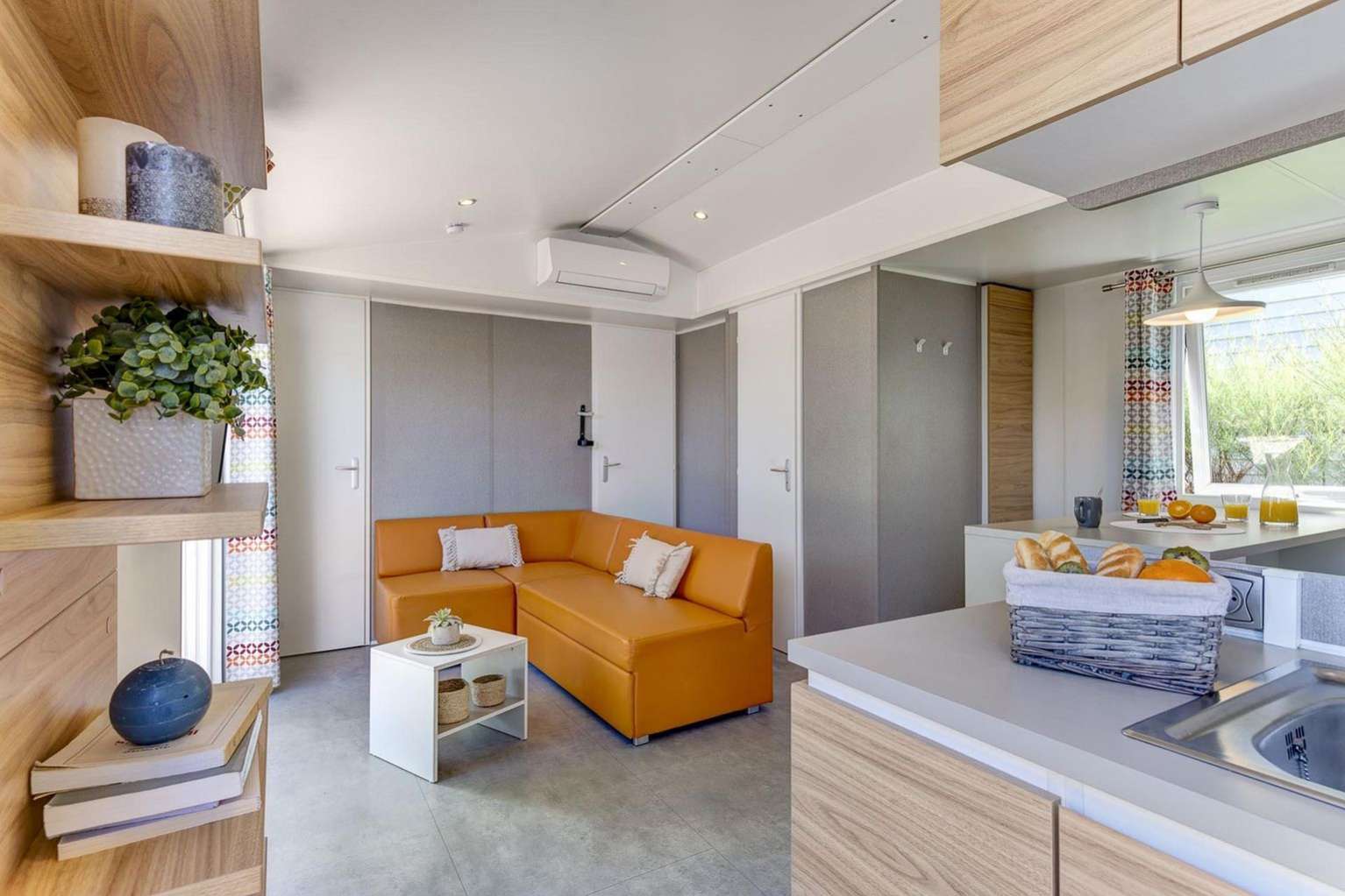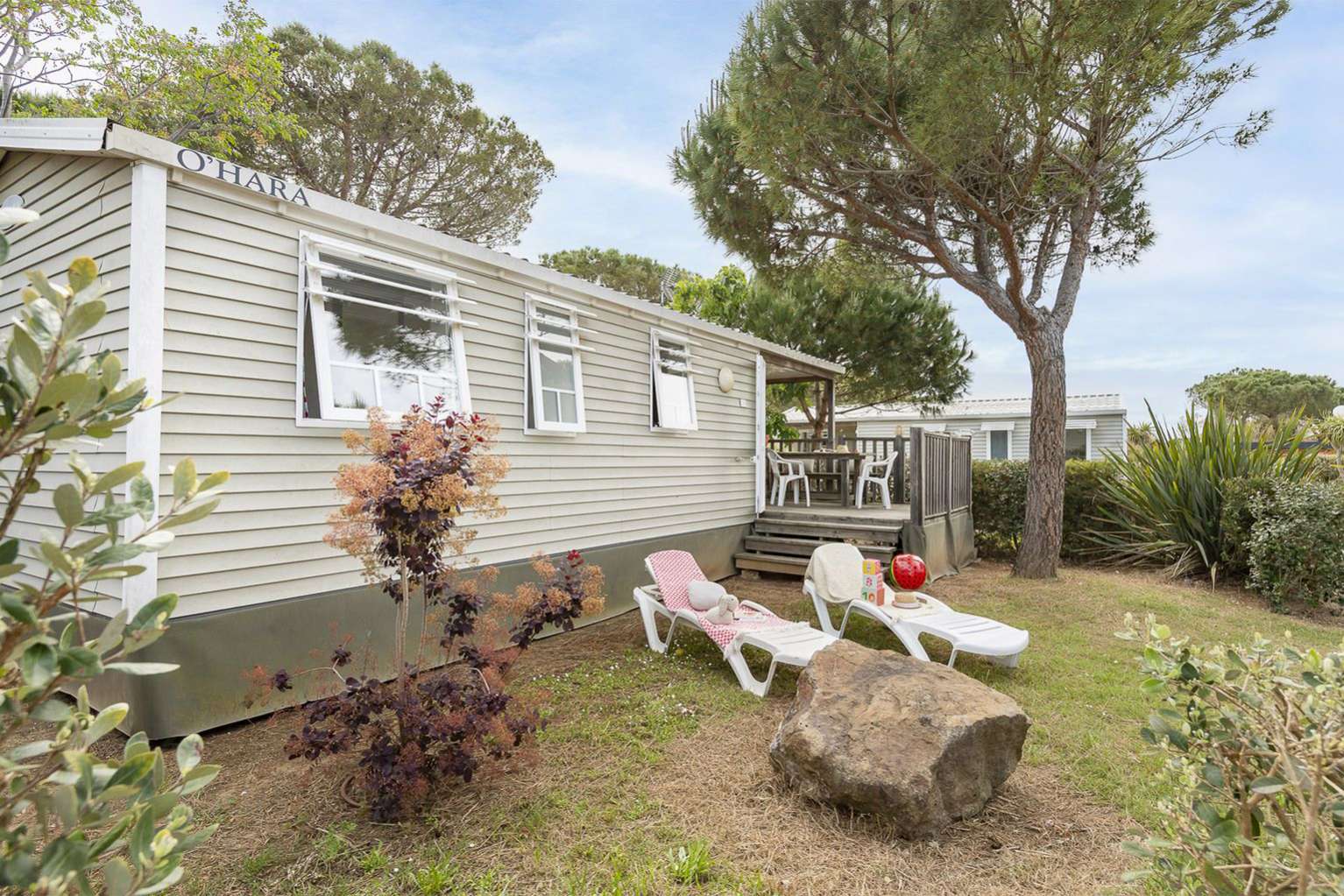 30 m² environ, la climatisation, une douche, un séjour, une chambre avec 1 lit 2 personnes, une chambre 3 lits 1 personne dont 1 lit simple, 1 lit gigogne et 1 superposé (déconseillé au -6ans), une terrasse semi-couverte avec un salon de jardin et bains de soleil.