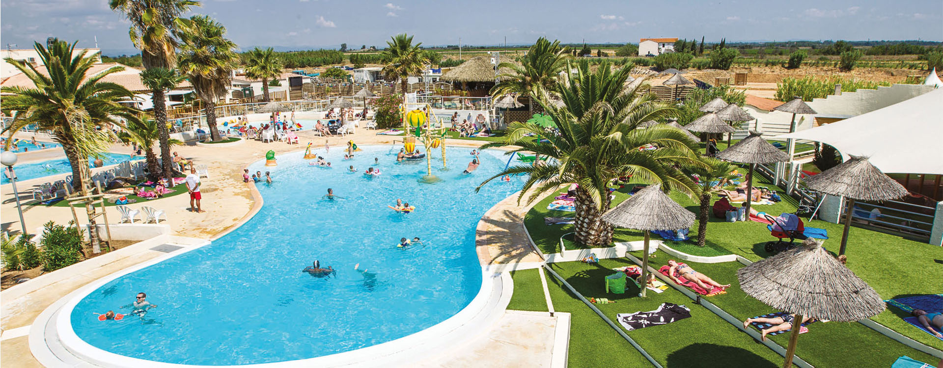 Le camping DOMAINE DE LA DRAGONNIÈRE, composé de 350 bungalows et 360 mobil-homes et emplacements tentes est situé à 5 km du centre de Vias et de la plage (navette payante plage de Portiragnes toute la saison).