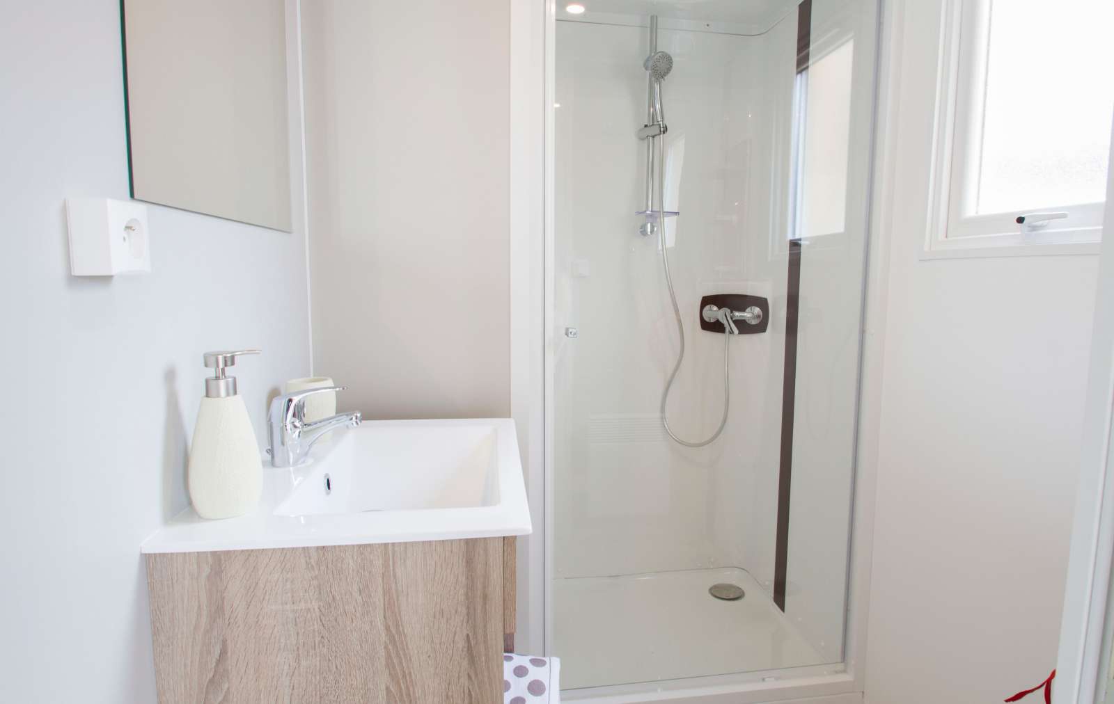 28 m² environ, coin cuisine avec micro-ondes, douche, coin séjour avec banquette-lit 2 personnes, une chambre 1 lit 2 personnes, une chambre 2 lits 1 personne, auvent avec salon de jardin et 2 bains de soleil