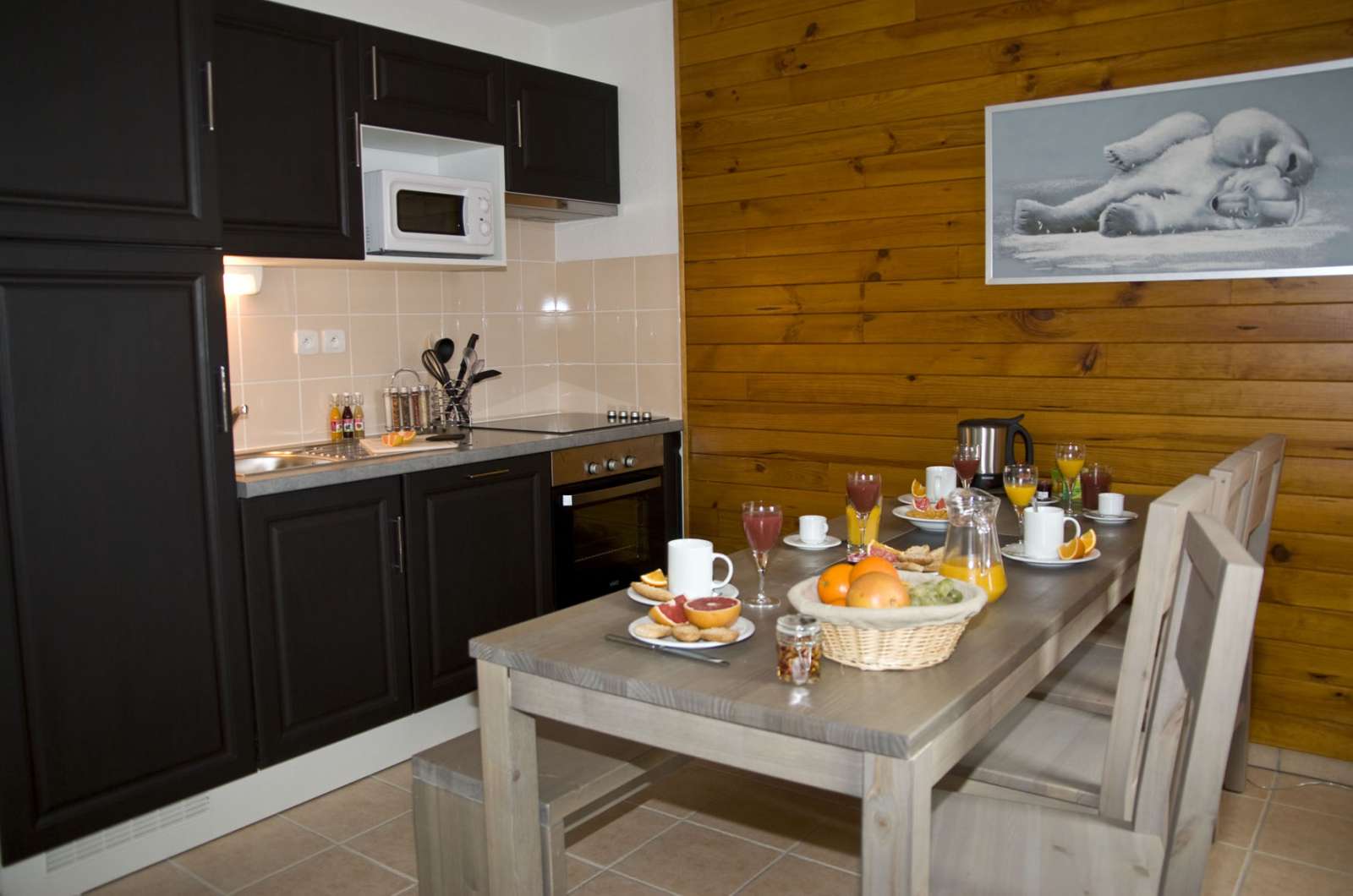 60 m² environ, un séjour avec un canapé-lit gigogne, une chambre 1 lit 2 personnes, deux chambres 2 lits superposés, une salle de bains et une douche. La majorité en duplex.