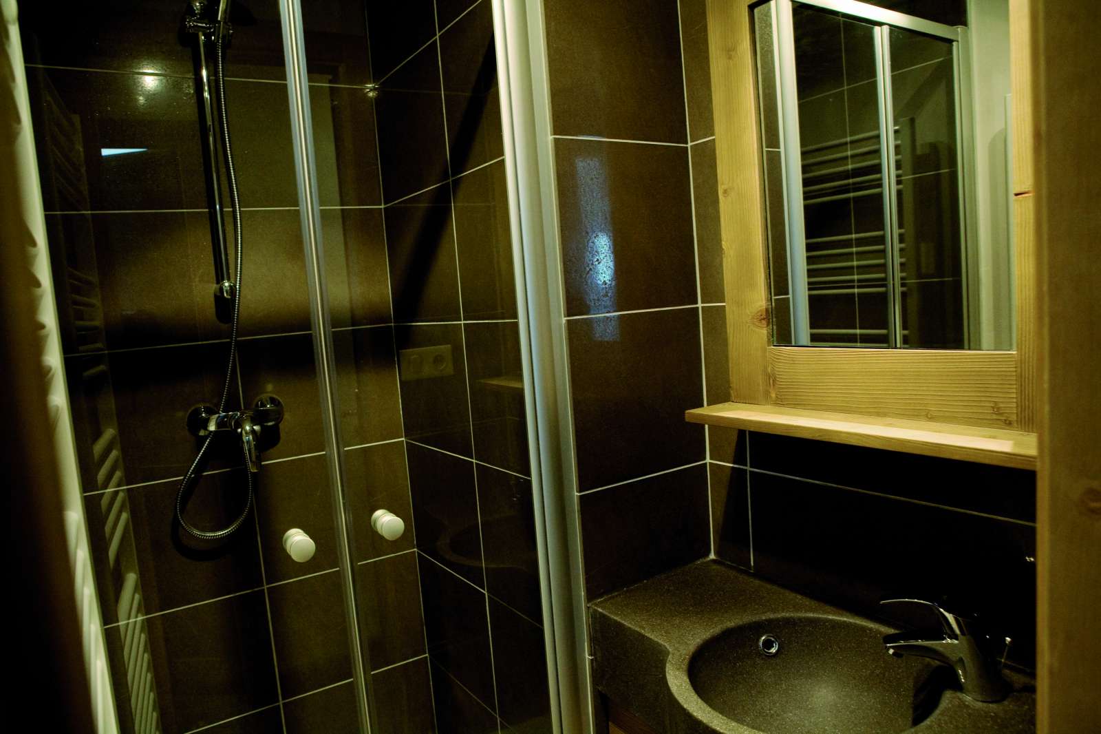 41/45 m², un séjour pour 2 personnes, une chambre 1 lit 2 personnes, chambre avec 2 lits superposés, salle de bains + douche. Côté pistes.